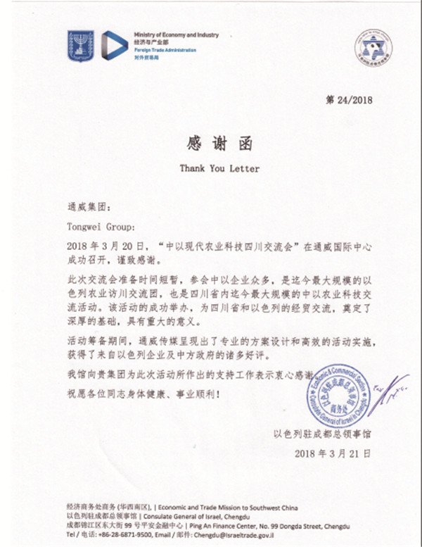 3月20日,由以色列駐成都總領(lǐng)事館主辦,四川省農(nóng)業(yè)廳、四川省科技廳、四川省貿(mào)促會(huì)支持,通威傳媒承辦的“中以現(xiàn)代農(nóng)業(yè)科技四川交流會(huì)”在通威國(guó)際中心隆重召開(kāi)。以色列駐成都總領(lǐng)事館總領(lǐng)事藍(lán)天銘、四川省農(nóng)業(yè)廳副廳長(zhǎng)朱萬(wàn)權(quán)出席并致辭,18家以色列農(nóng)業(yè)科技領(lǐng)軍企業(yè)及500余位政府、協(xié)會(huì)、企業(yè)代表參會(huì),是迄今為止四川省內(nèi)最大規(guī)模的中以農(nóng)業(yè)科技交流活動(dòng)。通威股份郭異忠總裁,國(guó)務(wù)院特殊津貼專家、通威股份首席水產(chǎn)專家吳宗文應(yīng)邀參會(huì)。活動(dòng)后,以色列駐成都總領(lǐng)事館專程向通威集團(tuán)發(fā)來(lái)感謝函,為通威團(tuán)隊(duì)的高效和專業(yè)點(diǎn)贊。