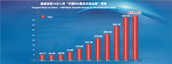 36年來,在十一屆全國(guó)政協(xié)常委、全國(guó)人大代表、通威集團(tuán)董事局劉漢元主席的高度重視和親自帶領(lǐng)下,通威品牌建設(shè)創(chuàng)新探索、與時(shí)俱進(jìn)、碩果累累,社會(huì)認(rèn)知度、美譽(yù)度逐年增強(qiáng)。從2004年的19億元,到2018年一舉突破550億元,通威品牌建設(shè)不斷刷新歷史新高。伴隨著集團(tuán)雙主業(yè)的發(fā)展壯大,15年來,通威品牌價(jià)值增長(zhǎng)近30倍,充分展示了全國(guó)乃至全球綠色農(nóng)業(yè)和綠色能源領(lǐng)軍品牌的雄厚實(shí)力。