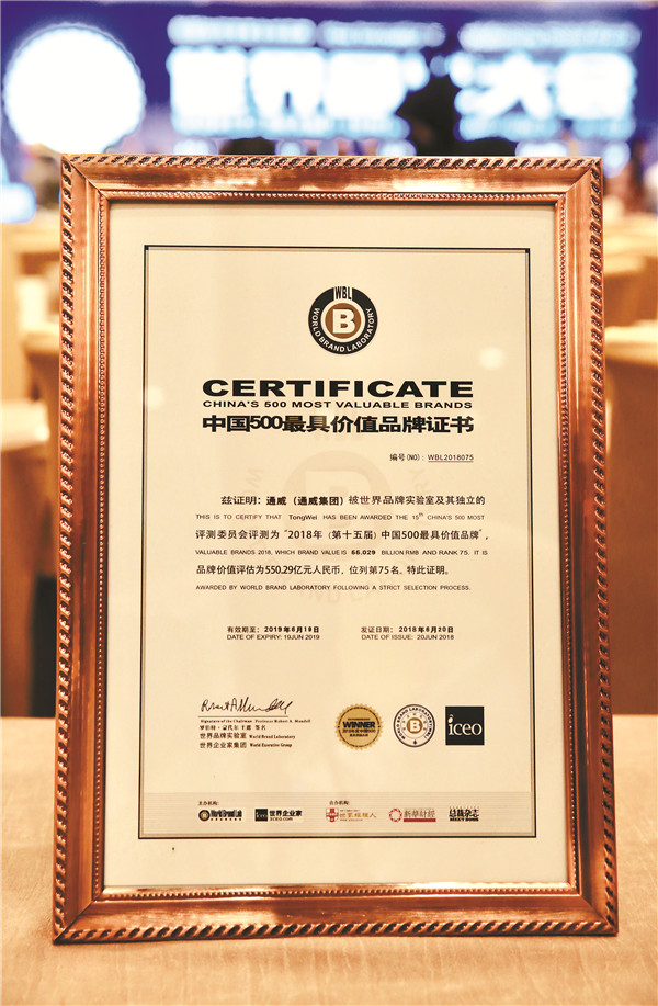 6月20日,2018年第十五屆世界品牌大會(huì)暨中國(guó)500最具價(jià)值品牌發(fā)布會(huì)在北京隆重舉行。繼去年品牌價(jià)值突破450億元后,今年通威集團(tuán)以550.29億元的品牌價(jià)值再次榮列榜單,連續(xù)15年入選公信力和認(rèn)同度最高、權(quán)威性最強(qiáng)的中國(guó)品牌國(guó)家隊(duì)行列。
