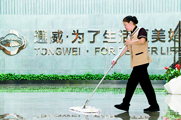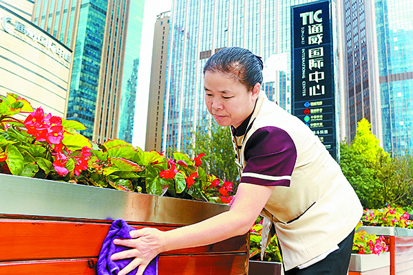 李茂群反復(fù)擦洗通威國(guó)際中心外圍花臺(tái)