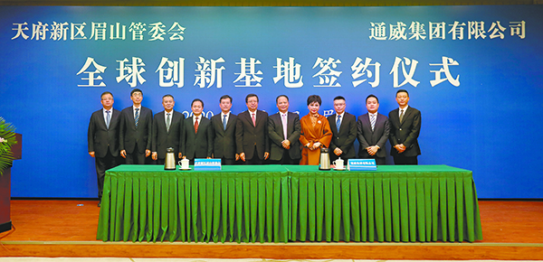 1月6日,通威集團全球創新基地項目簽約儀式舉行,標志著通威集團全球創新基地正式落戶眉山天府新區。眉山市委書記慕新海、通威集團董事局劉漢元主席出席儀式并致辭。眉山市委副書記胡元坤主持簽約儀式。通威集團董事長管亞梅,四川天府新區管委會辦公室副主任、天府新區眉山管委會主任梁磊分別代表通威集團、眉山天府新區簽約。