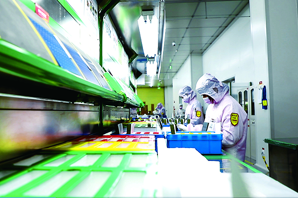 復工第一天的通威太陽能生產車間,在 充分防疫措施保障下,各項工作有序開展