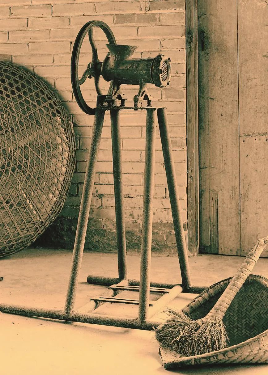劉漢元主席試驗渠道金屬網(wǎng)箱養(yǎng)魚時用于生產(chǎn)飼料的絞肉機(jī)