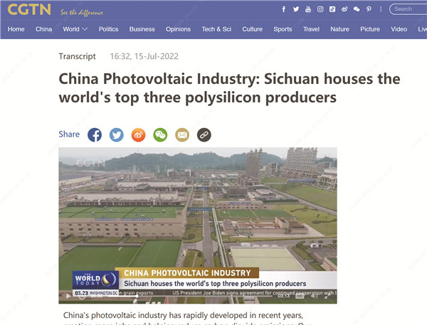 7月15日,CGTN中國國際電視臺在《The World Today》欄目播出了一則以“China Photovoltaic Industry: Sichuan houses the world's top three polysilicon producers”(中國光伏產業(yè):四川擁有世界前三大多晶硅生產商)為題的報道,向全世界推介永祥股份。
