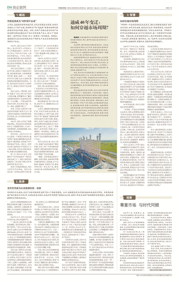 提及通威股份的成長邏輯,劉漢元主席對《中國經營報》記者表示:“一是技術進步,二是社會需求。起初從渠道金屬網箱式流水養(yǎng)魚技術做起,我們越來越肯定地認為,農業(yè)的技術進步,需要工業(yè)化的推動。通威希望和農民協(xié)同發(fā)展,助力中國的傳統(tǒng)農業(yè)向現代農業(yè)逐漸過渡。進入光伏行業(yè)后,公司在技術上的研發(fā),同樣支撐了公司的行業(yè)地位。不同的發(fā)展時期,有著不同的社會發(fā)展需求。通威的兩次選擇,都是當時社會最需要的。”