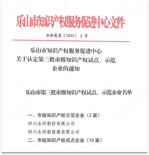 永祥股份、永祥新能源入列樂(lè)山市第三批市級(jí)知識(shí)產(chǎn)權(quán)試點(diǎn)、示范企業(yè)名單