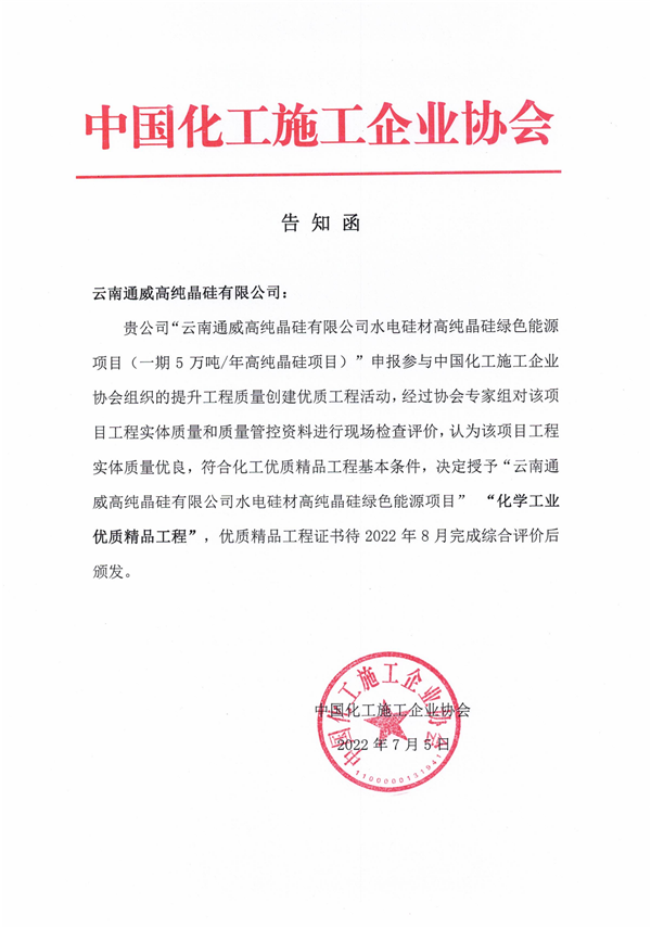 云南通威一期項(xiàng)目榮獲化學(xué)工業(yè)優(yōu)質(zhì)精品工程獎(jiǎng)