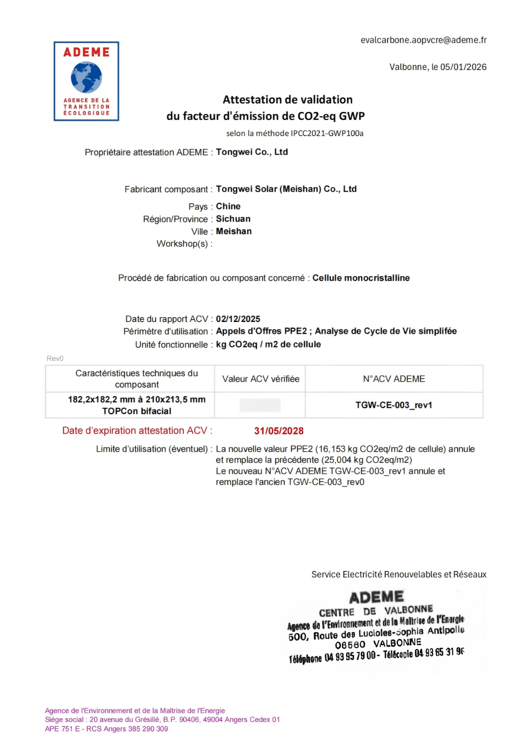 通威太陽能(眉山)有限公司TOPCon產品榮獲法國碳足跡認證證書