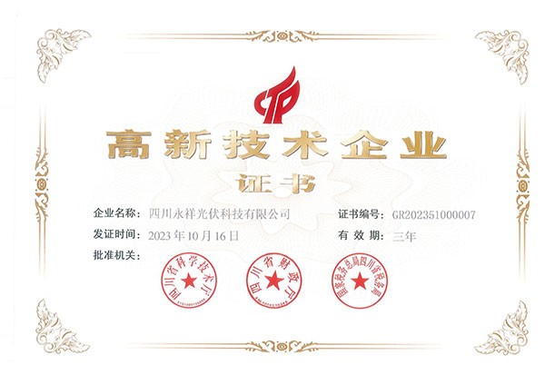 永祥光伏科技獲得高新技術企業榮譽稱號