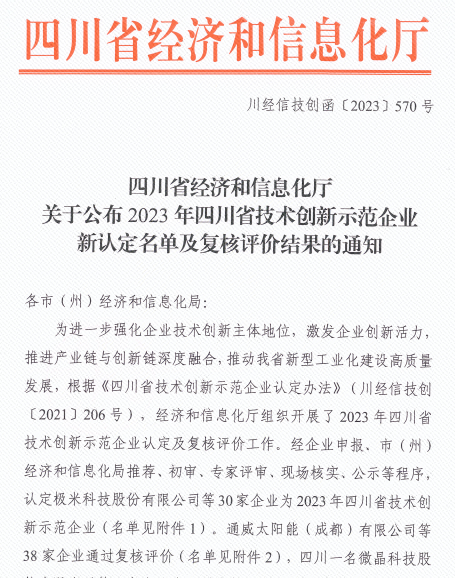 通威太陽能雙流基地順利通過“2023年省技術創新示范企業”復核