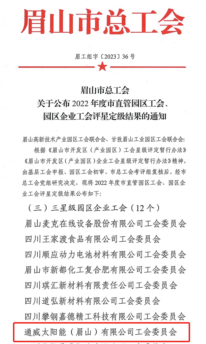 通威太陽能眉山基地工會獲評2022年度三星級市直管園區企業工會