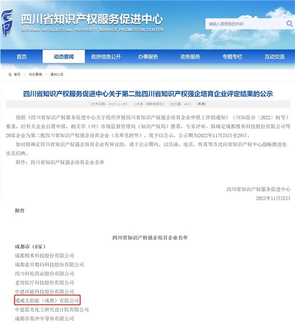 通威太陽(yáng)能雙流基地成功入選“四川省知識(shí)產(chǎn)權(quán)強(qiáng)企培育企業(yè)”
