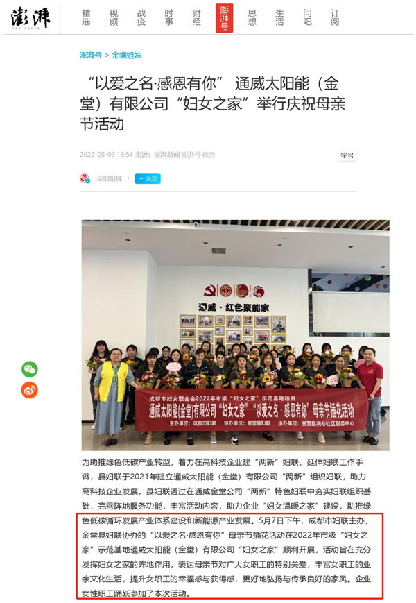 澎湃新聞聚焦通威太陽能金堂基地婦聯工作