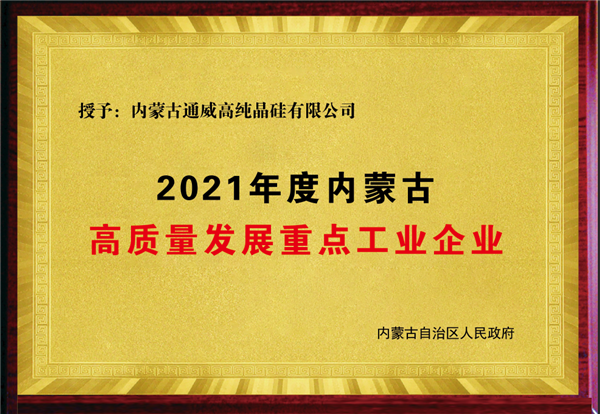 內蒙古通威獲評“內蒙古自治區高質量發展重點工業企業”