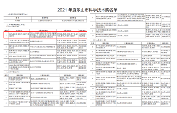 永祥榮獲樂山市科學技術進步獎一等獎