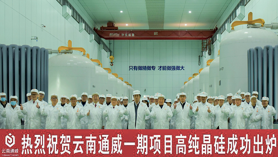 云南通威一期5萬(wàn)噸高純晶硅項(xiàng)目首批高純晶硅正品成功出爐