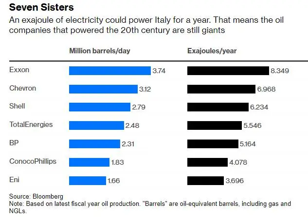 要了解如何進(jìn)行對(duì)比,可以先把大型石油公司生產(chǎn)的每桶原油或每立方米天然氣,轉(zhuǎn)換成一種能量計(jì)量單位——艾焦耳(exajoules)。一艾焦耳的電力可供澳大利亞或意大利這樣的國(guó)家使用一年。大型石油公司正在大量產(chǎn)出這些能量:??松梨诿磕甏蠹s產(chǎn)出8.3艾焦耳,殼牌每年大約產(chǎn)出6.2艾焦耳。