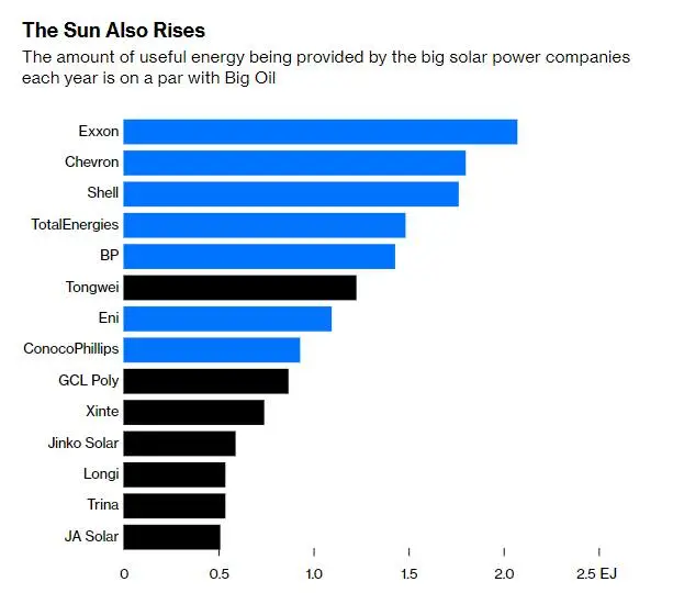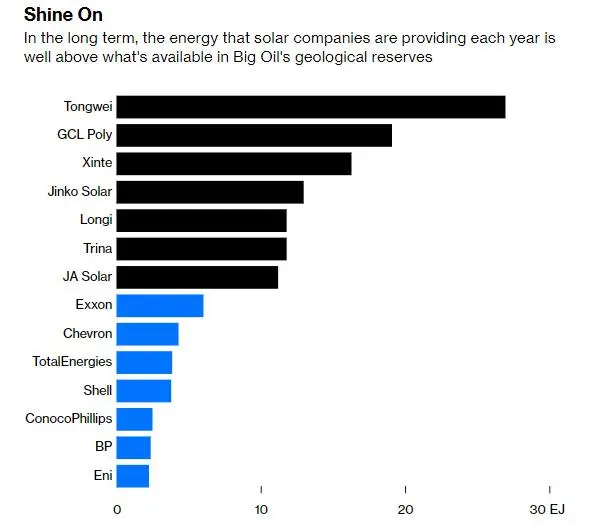 按年度產(chǎn)出的有用能量計(jì)算,目前最大的多晶硅生產(chǎn)商通威,已可以與英國(guó)石油公司、埃尼公司和康菲石油等一些最大的歐美石油公司正面交鋒,而其他一些電池板制造商也不算落后太多。如果通威繼續(xù)執(zhí)行去年12月份宣布的計(jì)劃,在內(nèi)蒙古建設(shè)一座40萬(wàn)噸的高純晶硅項(xiàng)目及配套設(shè)施,將其目前的產(chǎn)量提高近一倍,那么它甚至有可能超過(guò)歐美石油行業(yè)的“老大哥”??松梨冢?/span>