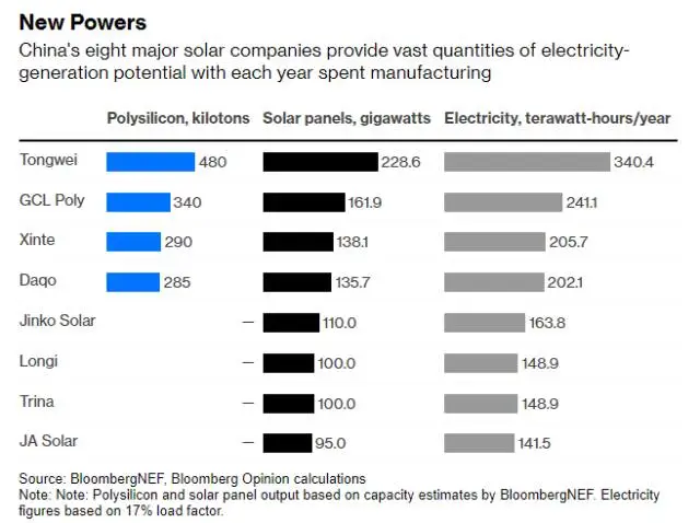 Fickling隨后將利用太陽(yáng)能的設(shè)備也進(jìn)行了類似的轉(zhuǎn)化。通威股份、協(xié)鑫科技、新特能源等生產(chǎn)太陽(yáng)能電池板所需的多晶硅原料的公司,都以公噸/年為單位來(lái)衡量其產(chǎn)量,將這轉(zhuǎn)換為隆基綠能、晶科能源等公司制造的太陽(yáng)能電池板的吉瓦數(shù),并最終轉(zhuǎn)換為由此產(chǎn)生的艾焦耳,便能較為簡(jiǎn)單地得出結(jié)論。