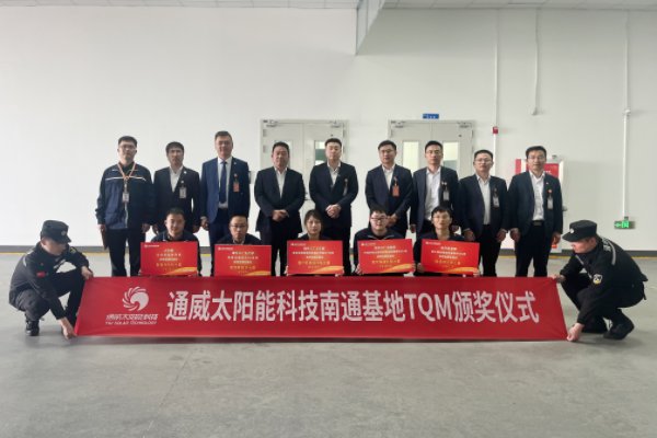 近日,通威太陽能科技成功舉行2024年第一季度TQM頒獎儀式。通威股份總裁助理、通威太陽能科技有限公司總經理蕭圣義,通威太陽能(鹽城)有限公司副總經理翟緒錦,通威太陽能(合肥)有限公司總經理助理李冬生,通威太陽能(四川)有限公司總經理助理朱劍誠,通威太陽能科技南通基地相關負責人出席活動并為獲獎代表頒獎。