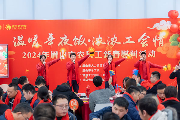 在新春佳節來臨之際,為深入貫徹落實中國工會十八大和省工會十五大精神,扎實做好農民工服務保障工作,切實增強農民工的獲得感和幸福感。2月1日,由眉山市人力資源和社會保障局、眉山市總工會主辦,甘眉工業園區工會聯合會協辦,通威太陽能眉山基地承辦的“溫暖年夜飯·濃濃工會情”2024年眉山市農民工新春慰問活動在眉山基地暖心舉行。眉山市總工會黨組書記、常務副主席王艷,眉山市人社局黨組成員、市就業局局長向陽,通威太陽能眉山基地總經理助理姚騫,眉山基地工會主席、副主席及相關部門負責人以及200名基地農民工代表出席了本次活動。