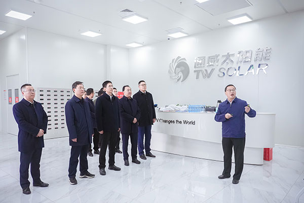 在調研過程中,眉山天府新區相關負責人向陳煒秘書長詳細介紹了新區高新產業,并了解了通威太陽能的發展歷程、技術創新、市場份額等方面的情況。隨后,調研團隊深入車間近距離觀摩通威太陽能高度自動化生產線及智能化制造設備運轉,直觀了解生產線最新實況。調研期間,陳煒秘書長特別關注了通威太陽能的技術創新和綠色生產,對公司在可再生能源領域及提升清潔能源利用效率方面的努力給予高度評價。