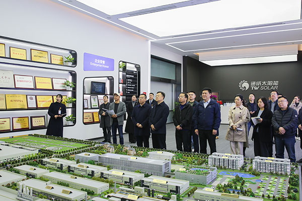 在通威太陽能智能制造展廳,辜學斌部長一行聽取通威太陽能發展歷程、項目建設、產能布局、綠色發展、智能制造及取得的榮譽獎項等相關情況介紹,詳細了解了通威太陽能雙流基地項目建設進度、項目投產情況、產能規劃等基本情況。調研現場,辜學斌部長就光伏行業上中下游產業布局、行業發展動態等問題同周華總經理展開交流,深入了解了通威太陽能的發展模式以及各板塊產業布局情況。