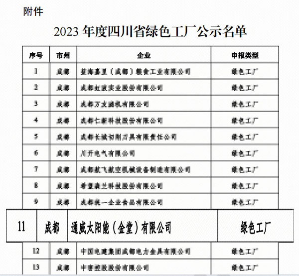 11月27日,四川省經濟和信息化廳發布了《2023年度四川省綠色制造名單公示》(公示期截至12月8日),通威太陽能金堂公司成功入選2023年度“四川省綠色工廠”,這是繼雙流、眉山基地之后,公司榮獲的又一綠色制造體系榮譽。