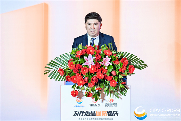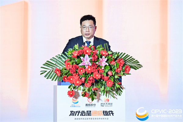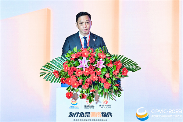 通威股份光伏商務(wù)部組件全球營銷總經(jīng)理邱新在致辭中首先對(duì)蒞臨現(xiàn)場(chǎng)的領(lǐng)導(dǎo)嘉賓致以衷心的感謝,并表示,今年是通威入局組件的第一個(gè)自然年,這一年的發(fā)展離不開廣大伙伴的支持,也離不開這個(gè)沉淀定力的時(shí)代。時(shí)代為何選擇通威?選擇通威就是選擇高效、選擇誠信和選擇可靠。高效、誠信、可靠架起了合作交流的橋梁,也為共同建設(shè)綠色能源的未來、共同奔赴更美好的生活的提供了更多的選擇路徑。真誠期待與廣大行業(yè)同仁繼續(xù)攜手同行,共謀合作新篇,共繪興業(yè)愿景。