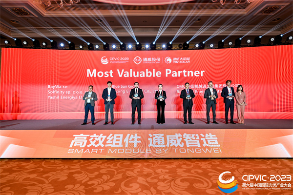 大會(huì)為長期以來支持、助力通威組件發(fā)展的合作伙伴頒獎(jiǎng),42家客戶分別獲得“同心共筑——通威組件供應(yīng)商合作獎(jiǎng)”“和衷共濟(jì)——通威組件合作伙伴價(jià)值獎(jiǎng)”“通力合作——通威組件供應(yīng)商品質(zhì)獎(jiǎng)”“征途與共——通威組件全球合作伙伴價(jià)值獎(jiǎng)”殊榮。