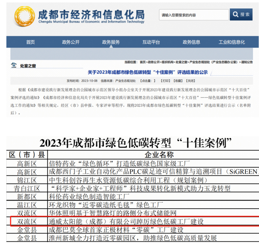 近日,成都市經濟和信息化局正對2023年成都市綠色低碳轉型“十佳案例”評選結果進行公示,通威太陽能雙流基地成功榮列其中。
