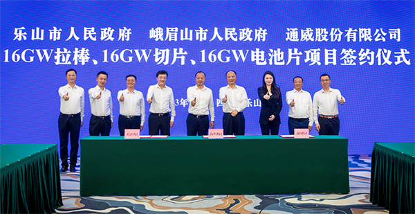 簽約儀式上,樂(lè)山市人民政府、五通橋區(qū)人民政府、峨眉山市人民政府與通威股份簽訂了《樂(lè)山市人民政府、五通橋區(qū)人民政府、通威股份有限公司16GW拉棒、16GW切片、16GW電池片項(xiàng)目投資協(xié)議》和《樂(lè)山市人民政府、峨眉山市人民政府、通威股份有限公司16GW拉棒、16GW切片、16GW電池片項(xiàng)目投資協(xié)議》。根據(jù)協(xié)議,通威股份將在五通橋區(qū)和峨眉山市分別投資100億元建設(shè)拉棒、切片、電池片項(xiàng)目,項(xiàng)目力爭(zhēng) 2024 年底建成投產(chǎn),2025 年底達(dá)產(chǎn)。