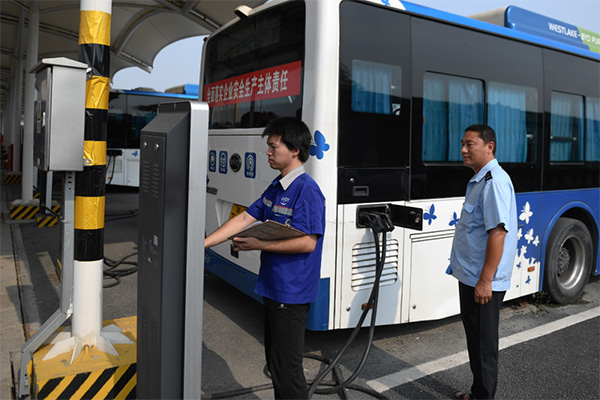 工作人員(左)在杭州公交電車公司拱康路維保站檢查純電動公交車的充電情況