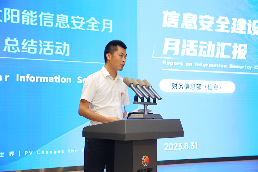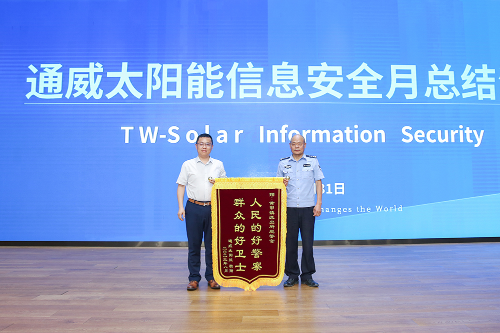 8月31日,通威太陽能 2023 年信息安全月總結活動圓滿舉行,此次活動特邀黃甲派出所趙正剛警官一行蒞臨現場并開展防詐知識宣講,通威太陽能總經理周華、副總經理宋梟、總經理助理陳君及各基地中高管團隊、員工代表出席活動。