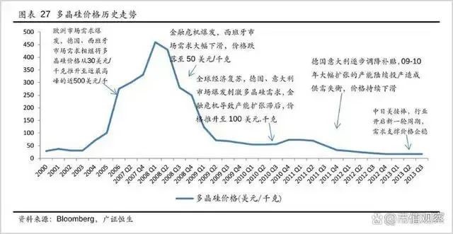 回顧多晶硅產(chǎn)業(yè)的發(fā)展歷史,世紀(jì)之初,光伏新能源產(chǎn)業(yè)開始崛起,由于下游組件廠瘋狂擴(kuò)張,對(duì)上游需求持續(xù)暴漲,引發(fā)硅料價(jià)格在2007年底飆升到每公斤近500美元的歷史高點(diǎn)。