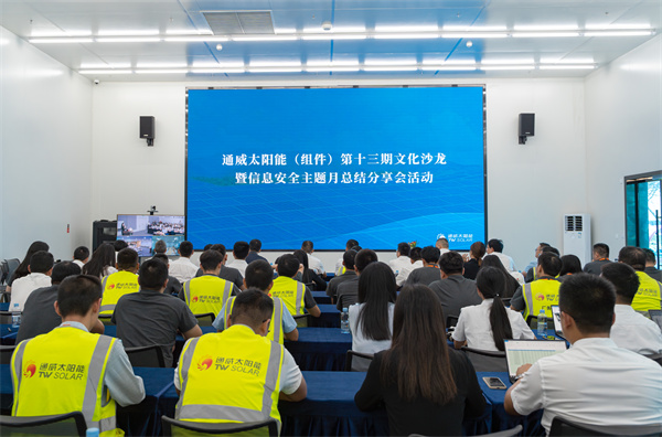 8月31日,通威太陽能(組件)人事行政部組織開展了第十三期文化沙龍暨信息安全主題月總結分享會活動。通威股份總裁助理、通威太陽能(合肥)有限公司總經理蕭圣義,通威太陽能(鹽城)有限公司副總經理翟緒錦,通威太陽能(四川)有限公司組件一廠廠長朱劍誠攜各基地部門負責人及員工代表共計200余人參加活動。