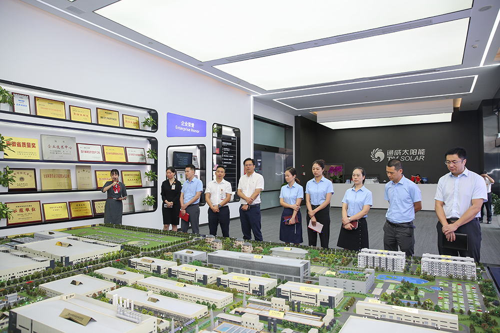 在通威太陽能智能制造展廳,交流團一行聽取通威太陽能發展歷程、項目建設、產能布局及取得的榮譽獎項等相關情況介紹,詳細了解了通威太陽能雙流基地項目建設進度、項目投產情況、產能規劃等基本情況。