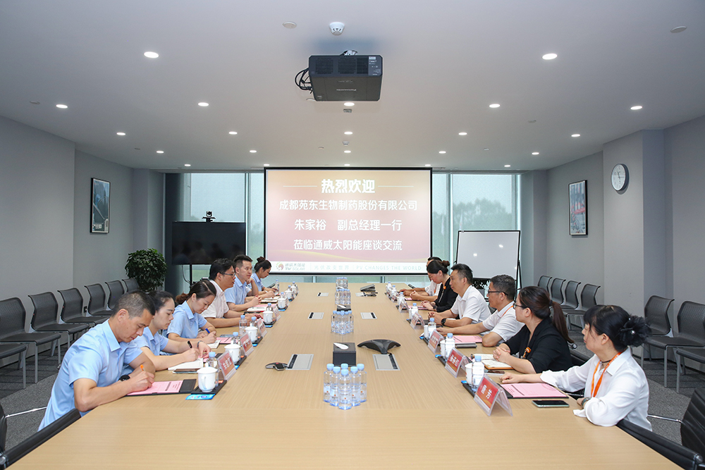 8月25日,成都苑東生物制藥股份有限公司副總經理朱家裕一行到訪通威太陽能雙流基地參觀交流,通威太陽能總經理助理陳君攜人事行政部、安全環境部、光伏學習中心相關負責人熱情接待并座談。
