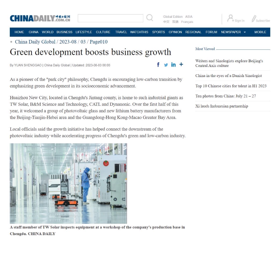 8月3日,中國日報以《Green development boosts business growth》為題,聚焦通威太陽能助力成都綠色經濟發展,充分展現引領行業的通威速度。