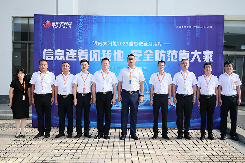 為應對當前日益復雜的信息安全形勢,進一步普及信息安全知識,加強公司全員信息安全意識,激發信息安全主人翁意識。7月31日,通威太陽能安徽公司、雙流基地、眉山基地、金堂基地、通合項目及彭山基地同步舉行第三屆信息安全月啟動儀式。通威太陽能總經理周華、副總經理宋梟、總經理助理陳君及各基地中高管團隊出席本次啟動儀式。啟動儀式現場,各地中高管團隊在主題墻上簽名及合影留念,正式啟動通威太陽能第三屆信息安全月。