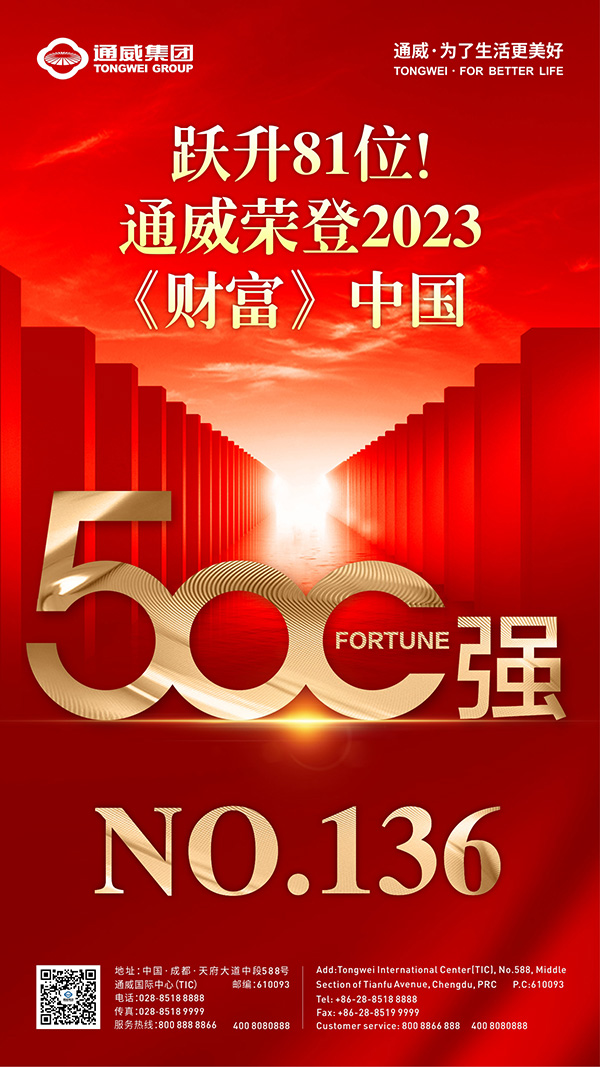 7月25日,財富Plus APP發布了2023年《財富》中國500強排行榜。憑借良好的營收及利潤表現,通威榮列榜單第136位,較去年躍升81位。