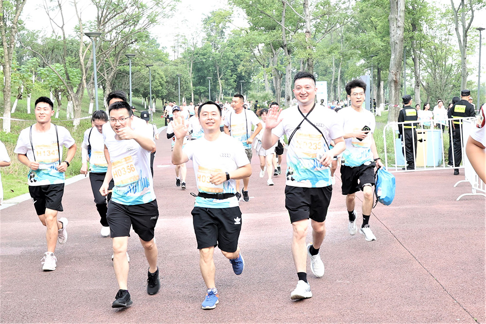 當(dāng)日清晨,參賽的通威黨員干部、入黨積極分子們早早地便聚集在桂溪生態(tài)公園,進(jìn)行熱身運(yùn)動(dòng)等準(zhǔn)備工作。上午7:30,活動(dòng)正式鳴槍起跑,數(shù)千名參賽選手在數(shù)名川籍奧運(yùn)冠軍的帶領(lǐng)下,迎著朝陽肆意揮灑汗水和熱情。在涌動(dòng)的人流中,通威健兒們你追我趕、搶前爭先朝著終點(diǎn)飛馳躍進(jìn),大家矯健的運(yùn)動(dòng)身姿,成為了當(dāng)日賽場的一道亮麗風(fēng)景。