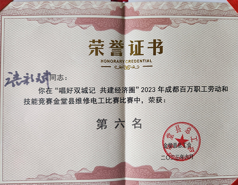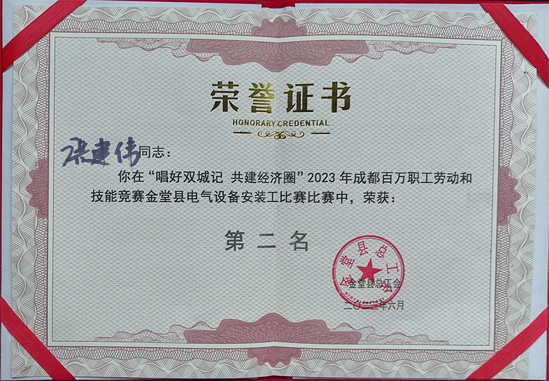 6月20日,為助力成渝地區雙城經濟圈建設,充分發揮職業技能競賽示范、引領、帶動作用,為區域建設提供更堅強有力的技能人才支撐,“唱好雙城記?共建經濟圈”2023年成都百萬職工勞動和技能競賽金堂縣電氣設備安裝工、維修電工比賽在四川省金堂縣職業高級中學舉辦。通合新能源2名員工分別榮獲電氣設備安裝工項目二等獎和維修電工項目三等獎。