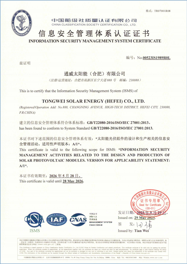 通威太陽能(合肥)有限公司榮獲 ISO/IEC 27001信息安全管理體系認證證書