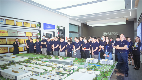交流團(tuán)一行先后參觀了公司智能制造展廳及黨工路線區(qū)。在通威太陽(yáng)能智能制造體驗(yàn)中心,交流團(tuán)一行詳細(xì)了解通威太陽(yáng)能發(fā)展歷程、產(chǎn)能規(guī)模、企業(yè)榮譽(yù)情況及戰(zhàn)略布局等情況,對(duì)公司的標(biāo)準(zhǔn)化、信息化、精細(xì)化管理給予高度肯定。在紅色聚能家黨工路線參觀過程中,交流團(tuán)一行對(duì)通威太陽(yáng)能職工之家的建設(shè)展現(xiàn)濃厚興趣,并表示通威太陽(yáng)能豐富多彩的文創(chuàng)產(chǎn)品和文化建設(shè)值得借鑒。