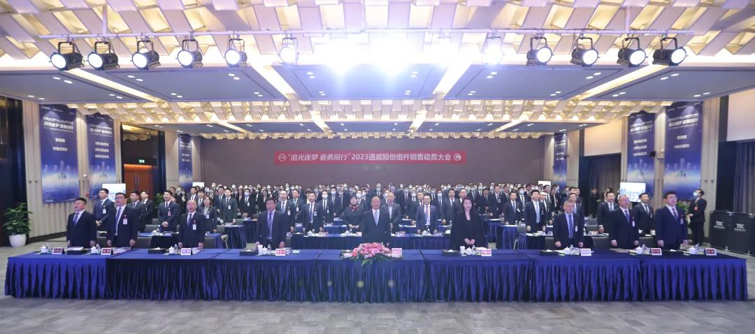 3月28日,以“追光逐夢 奮勇前行”為主題的通威股份2023組件銷售動員大會在通威國際中心如期舉行。全國人大代表、全國工商聯副主席、通威集團董事局劉漢元主席,通威股份董事長、CEO劉舒琪出席并作重要指示。通威股份總部各部門主要負責人、光伏技術中心核心團隊、組件生產及營銷團隊等干部員工全程參與。