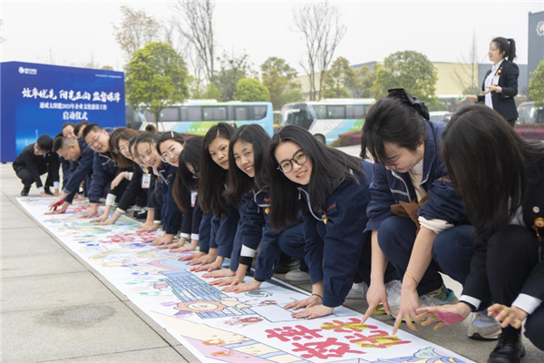 在員工簽署環節,來自各基地各廠部的200余名員工代表匯集在定制的彩色長卷四周,將代表“陽光”“正向”的彩色印泥按在手掌,印在長卷。長卷以“效率優先 陽光正向 監督保障”為主題,融合通威太陽能各基地標志建筑、陽光仔等圖案,寓意通威太陽能全體員工將以集團為引領,將通威文化、通威精神傳遞落實到生產、生活各個層面,真正做到將企業文化內化于心、外化于行、知行合一,最終助力生產經營,為集團和公司的穩健發展注入源源不斷的動力。