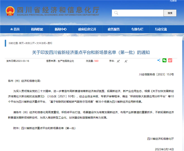 3月16日,四川省經濟和信息化廳官方網站正式公布了《關于印發四川省新經濟重點平臺和新場景名單(第一批)的通知》,通威太陽能眉山基地獲評“四川省新經濟應用新場景”。
