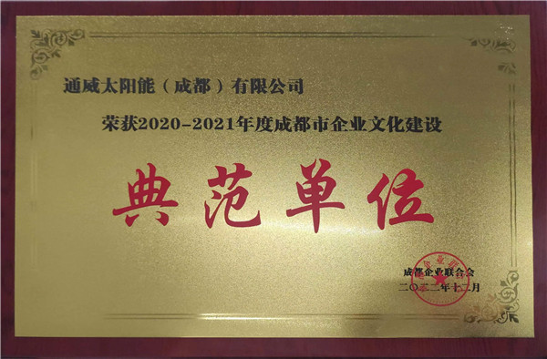本次評選活動由成都企業(yè)聯(lián)合會主辦。成都企業(yè)聯(lián)合會是經(jīng)成都市人民政府批準,由成都市經(jīng)濟和信息化委員會主管,經(jīng)成都市民政局核準登記的社團法人,評選活動每兩年舉辦一次。本次評選中,通威太陽能精心準備,通過詳實的材料全面生動地展示了公司企業(yè)文化建設(shè)取得的豐碩成果,最終從眾多參評企業(yè)中脫穎而出,榮膺“2020-2021年度成都市企業(yè)文化建設(shè)典范單位”。