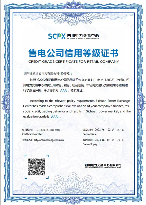 信用是市場的基礎(chǔ)。習(xí)近平總書記強(qiáng)調(diào),要完善社會信用等市場經(jīng)濟(jì)基礎(chǔ)制度,為各類經(jīng)營主體投資創(chuàng)業(yè)營造良好環(huán)境,激發(fā)各類經(jīng)營主體活力。作為通威集團(tuán)旗下綜合能源服務(wù)商,四川通威綠能電力有限公司始終秉持“誠、信、正、一”的經(jīng)營理念,在四川電力交易中心對全川售電公司的信用評價中喜獲AAA這一最高評級,全川僅有2%的售電公司獲此殊榮。